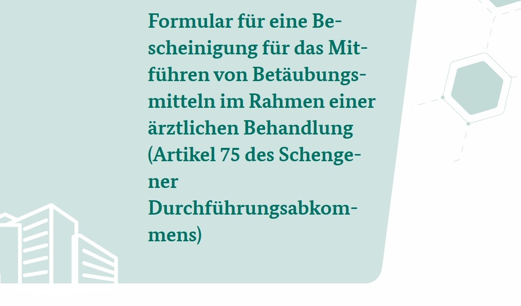 - Vom Gesundheitsamt beglaubigte Bescheinigung zum Mitführen von Betäubungsmitteln gem. Artikel 75 des Schengener Durchführungsabkommens